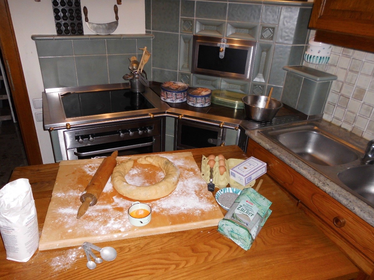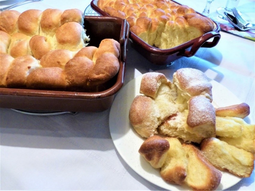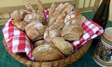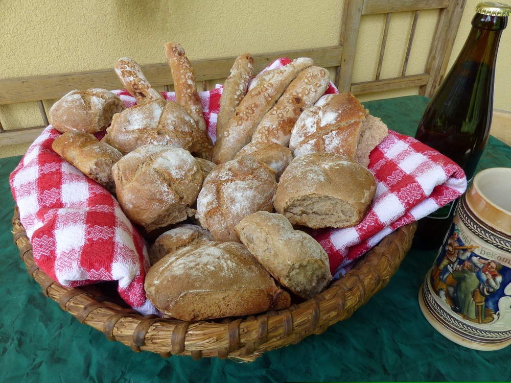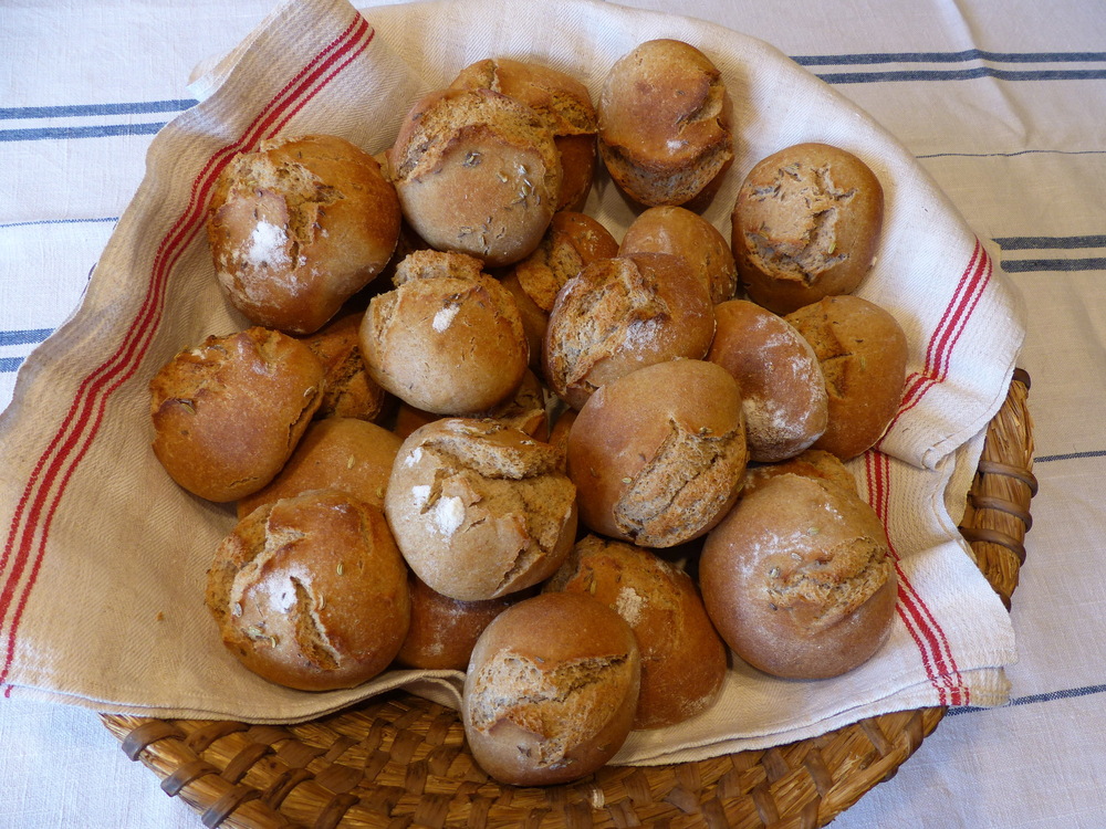 Möchte man Brotwecken, teilt man die Masse in 2 Teile und lässt sie in gut bemehlten Gärkörben aufgehen. Zum Backen wird der Teig aus den Gärkörben auf das ausgelegte Backblech gestürzt, mit Salzwasser bestrichen und gebacken.